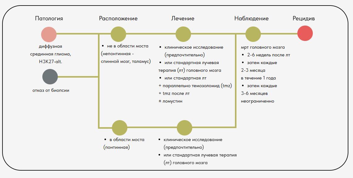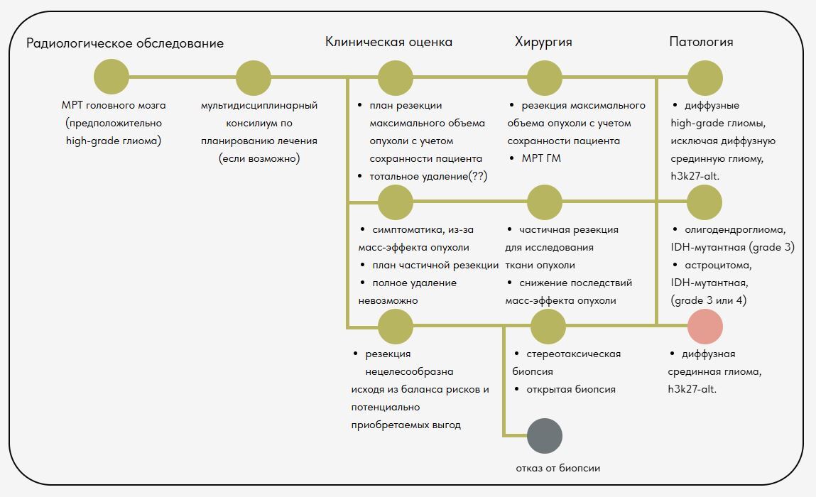 Фундаментальная этическая дилемма, возникающая в связи с существующим стандартом лечения, заключается в том, что если опухоль выглядит типично на МРТ, то, согласно рекомендациям (основанным на исследованиях, проведенных 20 лет назад), биопсию делать не следует. Потенциальный риск для конкретного ребенка, как он трактовался в то время, не мог быть сбалансирован потенциальной пользой. С тех пор изменились две вещи: